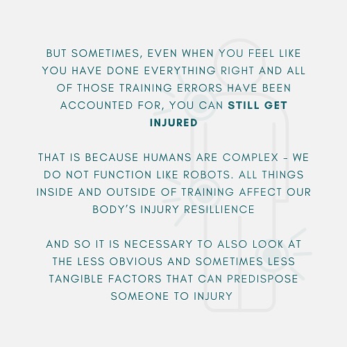Other times, the training program has been followed to a T, no obvious train terrors have been made, yet the athlete still got injured. In these situations the clues may be less obvious. Maybe the athlete is a new parent and pushing through training on little sleep, or they are under immense work stress and carrying an extra burden on their nervous system.